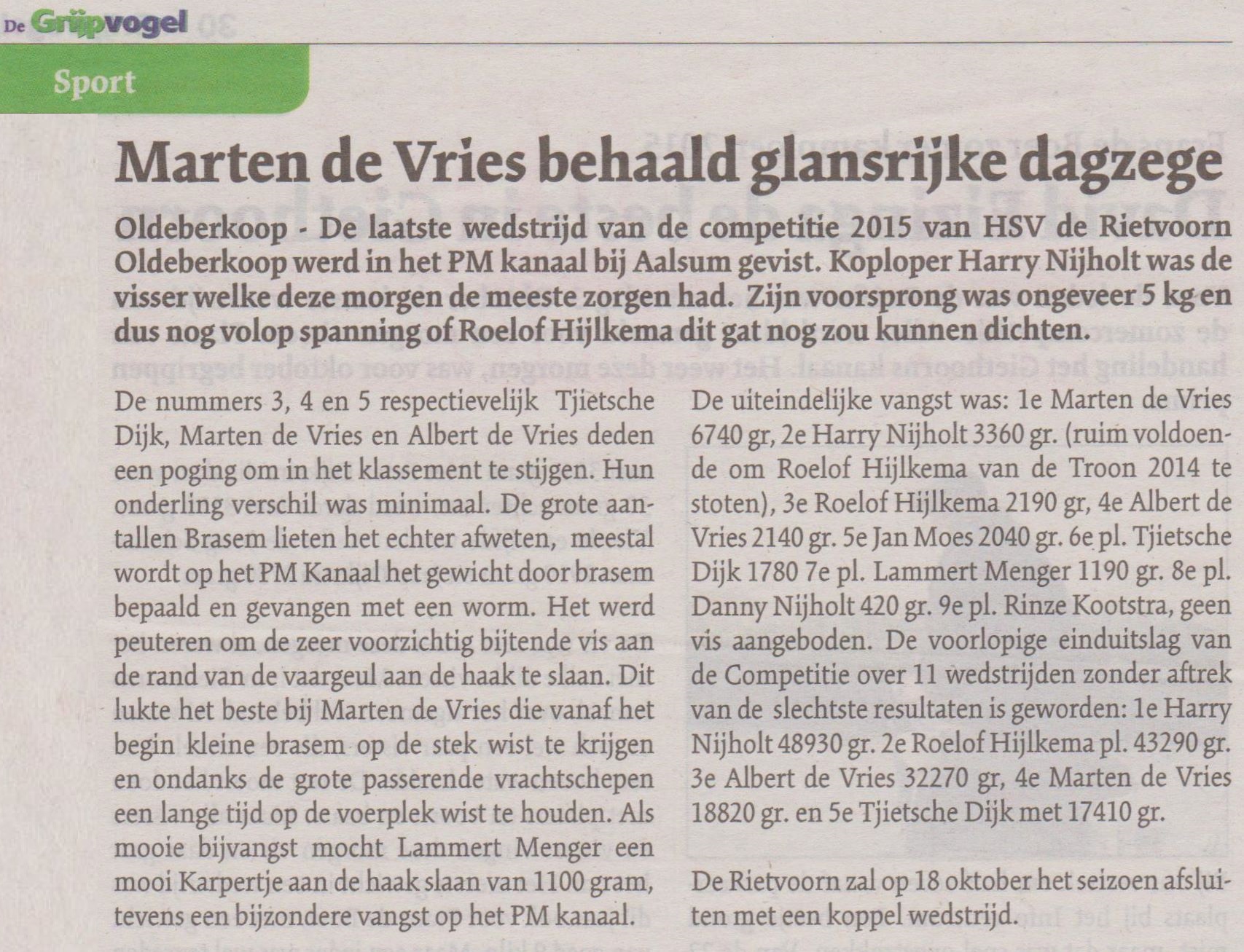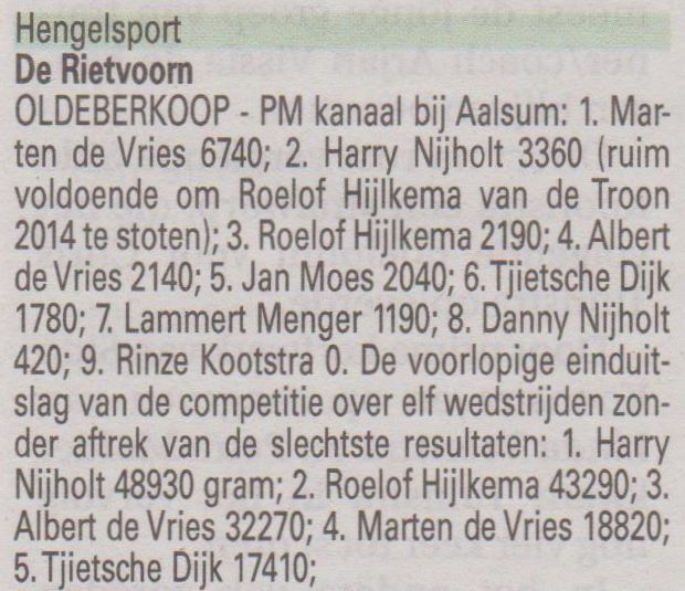 Zijn voorsprong was ongeveer 5 kg en dus nog volop spanning of Roelof Hijlkema dit gat nog zou kunnen dichten. De nummers 3, 4 en 5 respectievelijk Tjietsche Dijk, Marten de Vries en Albert de Vries deden een poging om in het klassement te stijgen. Hun onderling verschil was minimaal. De grote aantallen Brasem lieten het echter afweten, meestal wordt op het PM Kanaal het gewicht door brasem bepaald en gevangen met een worm. Het werd peuteren om de zeer voorzichtig bijtende vis aan de rand van de vaargeul aan de haak te slaan. Dit lukte het beste bij Marten de Vries die vanaf het begin kleine brasem op de stek wist te krijgen en ondanks de grote passerende vrachtschepen een lange tijd op de voerplek wist te houden. Als mooie bijvangst mocht Lammert Menger een mooi Karpertje aan de haak slaan van 1100 gram, tevens een bijzondere vangst op het PM kanaal. De uiteindelijke vangst was: 1e Marten de Vries 6740 gr, 2e Harry Nijholt 3360 gr. ( ruim voldoende om Roelof Hijlkema van de Troon 2014 te stoten), 3e Roelof Hijlkema 2190 gr, 4e Albert de Vries 2140 gr. 5e Jan Moes 2040 gr. 6e pl. Tjietsche Dijk 1780 7e pl. Lammert Menger 1190 gr. 8e pl. Danny Nijholt 420 gr. 9e pl. Rinze Kootstra, geen vis aangeboden. De voorlopige einduitslag van de Competitie over 11 wedstrijden zonder aftrek van de slechtste resultaten is geworden: 1e Harry Nijholt 48930 gr. 2e Roelof Hijlkema pl. 43290 gr. 3e Albert de Vries 32270 gr, 4e Marten de Vries 18820 gr. en 5e Tjietsche Dijk met 17410 gr. De Rietvoorn zal op 18 oktober het seizoen afsluiten met een koppel wedstrijd.