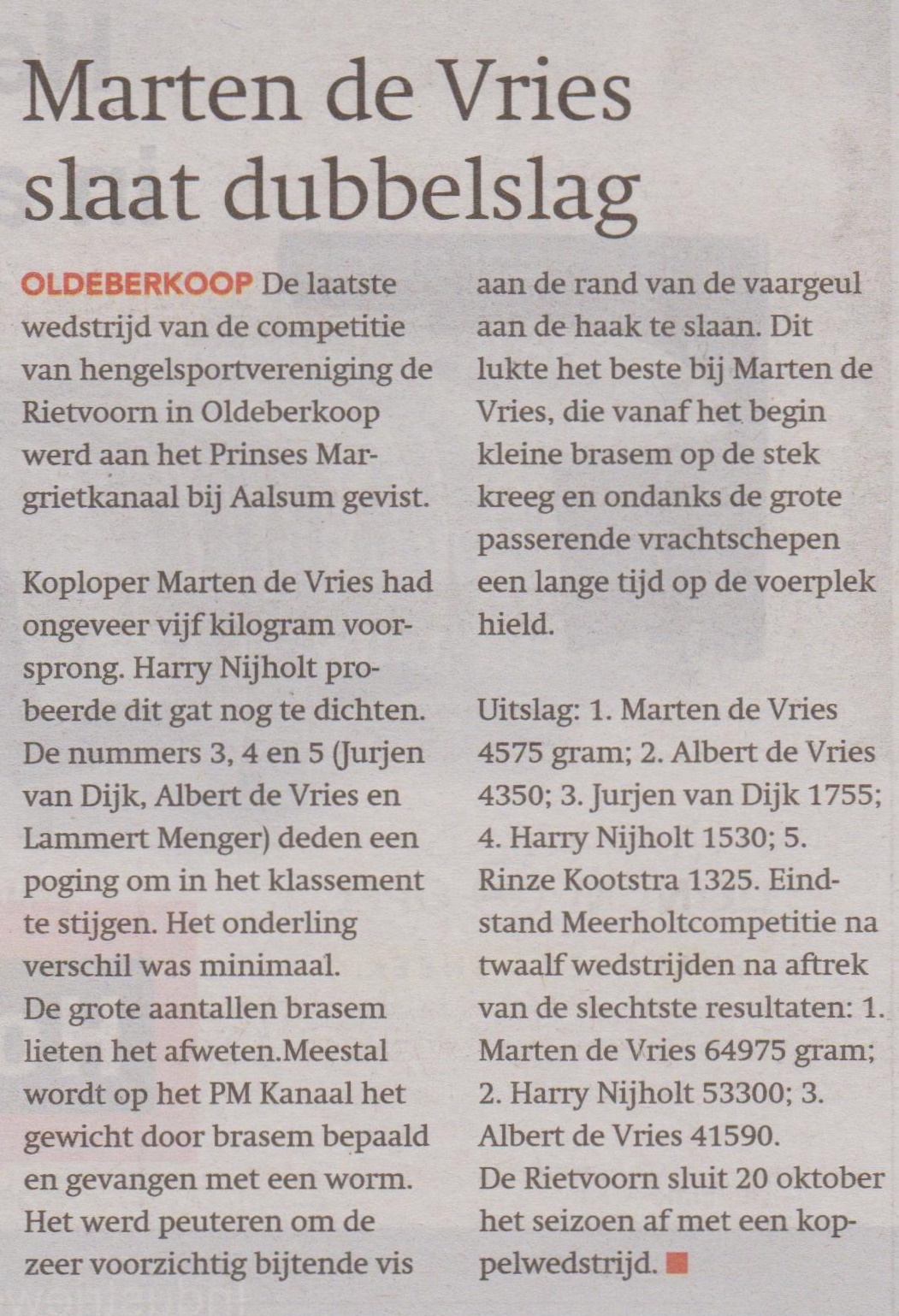 De uiteindelijke vangst was: 1e Marten de Vries 4575 gr, 2e Albert de Vries 4350 gr. 3e Jurjen van Dijk 1755 gr, 4e Harry Nijholt 1530 gr. 5e Rinze Kootstra 1325 gr.