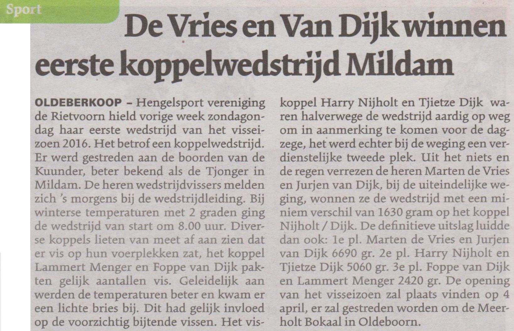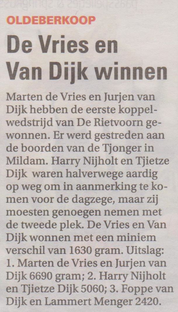 Bij winterse temperaturen met 2 graden ging de wedstrijd van start om 8.00 uur. Diverse koppels lieten van meet af aan zien dat er vis op hun voerplekken zat, het koppel Lammert Menger en Foppe van Dijk pakten gelijk aantallen vis. Geleidelijk aan werden de temperaturen beter en kwam er een lichte bries bij. Dit had gelijk invloed op de voorzichtig bijtende vissen. Het viskoppel Harry Nijholt en Tjietze Dijk waren halverwege de wedstrijd aardig op weg om in aanmerking te komen voor de dagzege, het werd echter bij de weging een verdienstelijke tweede plek. Uit het niets en de regen verrezen de heren Marten de Vries en Jurjen van Dijk, bij de uiteindelijke weging, wonnen ze de wedstrijd met een miniem verschil van 1630 gram op het koppel Nijholt / Dijk. De definitieve uitslag luidde dan ook: 1e pl. Marten de Vries en Jurjen van Dijk 6690 gr. 2e pl. Harry Nijholt en Tjietze Dijk 5060 gr. 3e pl. Foppe van Dijk en Lammert Menger 2420 gr. De opening van het visseizoen zal plaats vinden op 4 april, er zal gestreden worden om de Meerholt Bokaal in Oldeboorn, vertrek 6.30.
