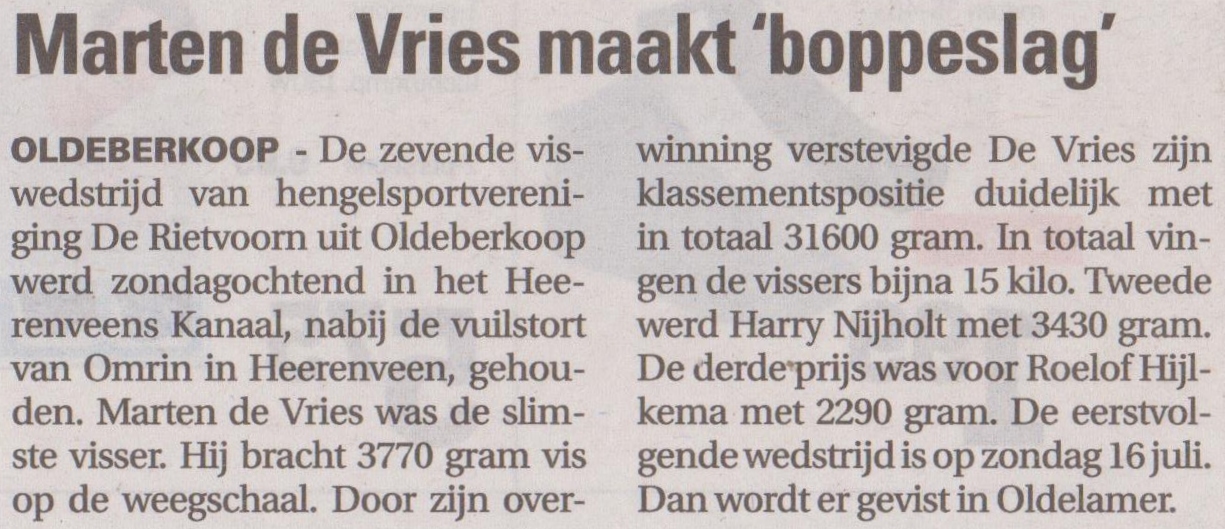 Marten de Vries was de slimste visser geweest, hij bracht 3770 gram vis op de weegschaal. Door zijn overwinning wist Marten zijn klassementspositie duidelijk te verstevigen met in totaal 31600 gram. In totaal werd er bijna 15 kilo gevangen. De overige resultaten waren: 2e pl. Harry Nijholt met 3430 gr. 3e pl. Roelof Hijlkema met 2290 gr. De overige resultaten kunnen nagelezen worden op de website van HSV de Rietvoorn. De eerst volgende wedstrijd is 16 Juli, er zal gevist worden te Oldelamer, vertrek 6.00 uur vanaf de rotonde.
