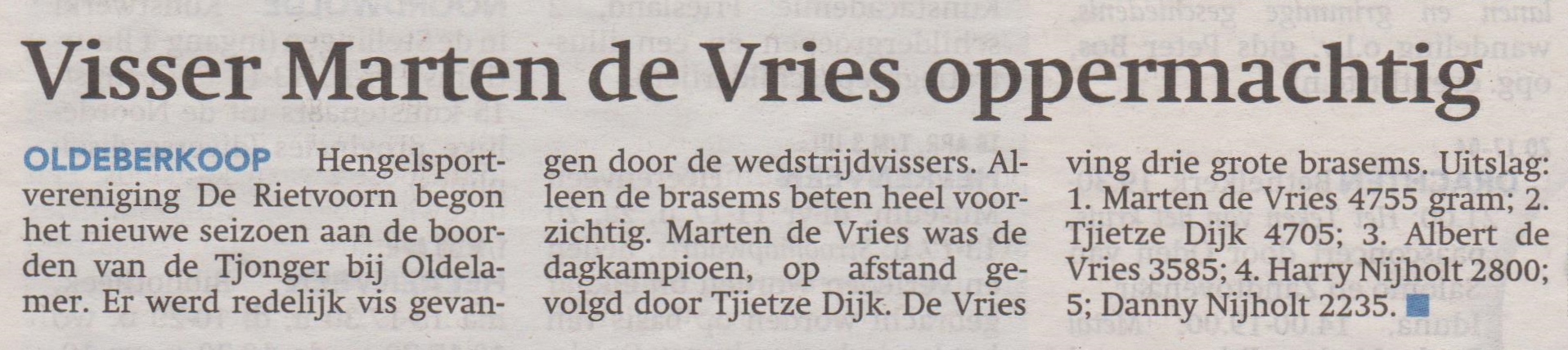 Er werd redelijk vis gevangen door de heren wedstrijdvissers, alleen de Brasems aasden heel voorzichtig. Marten de Vries was de dagkampioen gevolgd op afstand door Tjietze Dijk, de winst voor Marten zat hem in de 3 mooie grote Brasems, welke aangeboden werden aan de weegschaal. Beide heren zaten midden op het parcours, dus geen voordeel van de kopstekken.