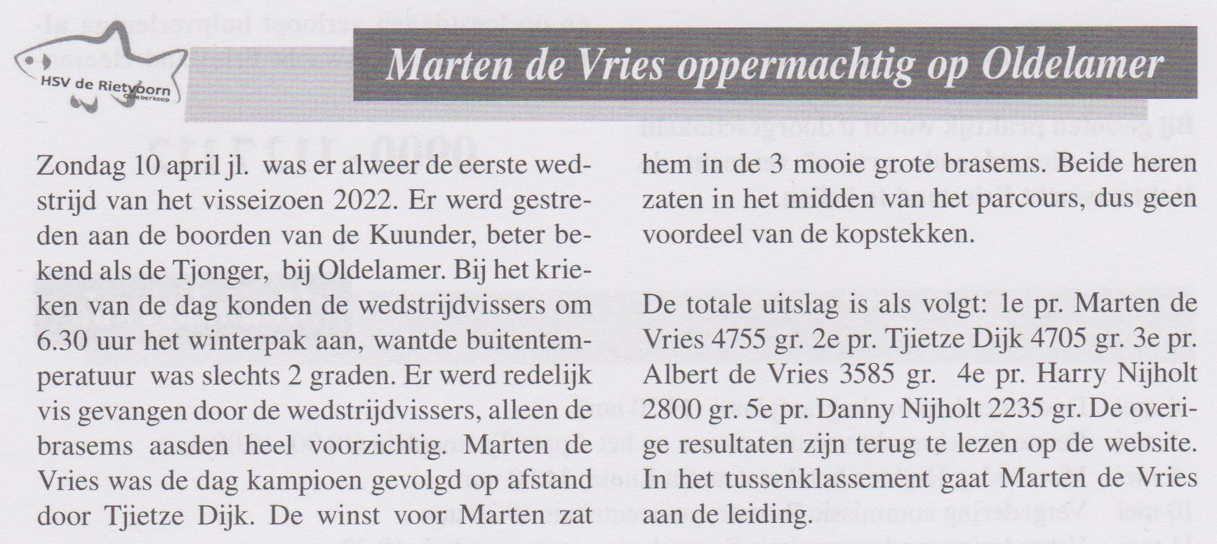 De totale uitslag luidde als volgt: 1e pr. Marten de Vries 4755 gr. 2e pr. Tjietze Dijk 4705 gr. 3e pr. Albert de Vries 3585 gr. 4e pr. Harry Nijholt 2800 gr. 5e pr. Danny Nijholt 2235 gr. De overige resultaten zijn terug te lezen op de website. In het tussenklassement gaat Marten de Vries aan de leiding De eerst volgende wedstrijd is op 24 april 2022 Aalsum, vertrek 6.00 uur bij de rotonde in Oldeberkoop.