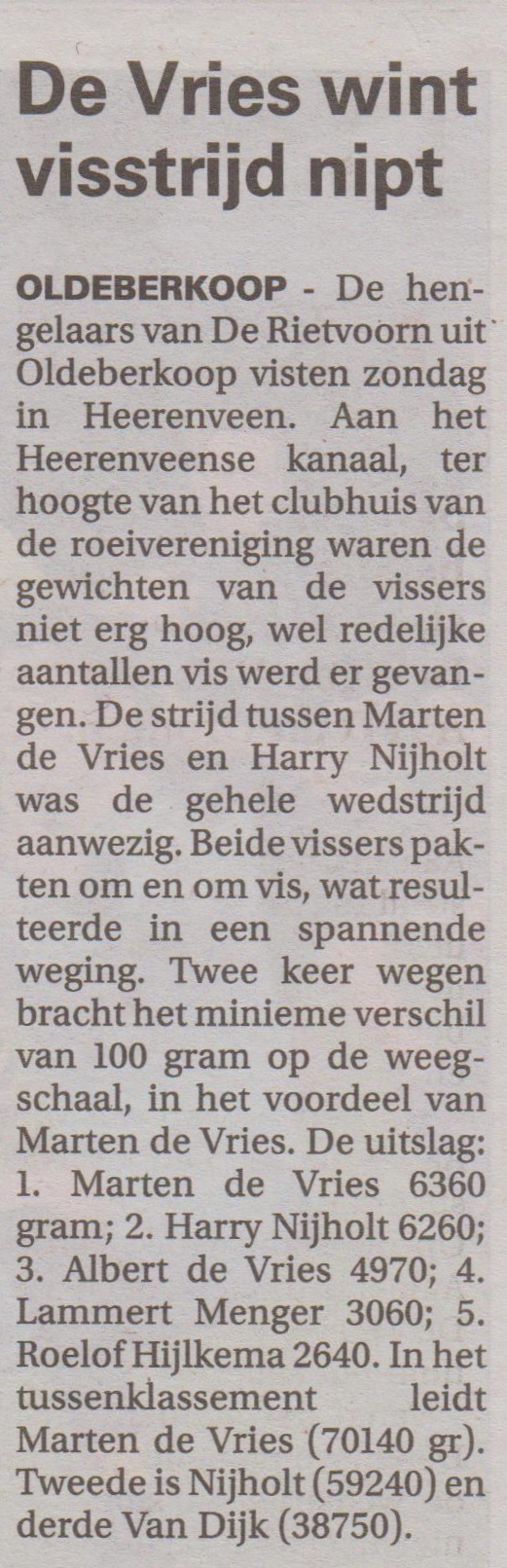 De strijd tussen Marten de Vries en Harry Nijholt was de gehele wedstrijd aanwezig, Beide vissers pakten om en om vis, wat resulteerde in een spannende weging, 2 keer wegen bracht het minieme verschil van 100 gram verschil op de weegschaal.