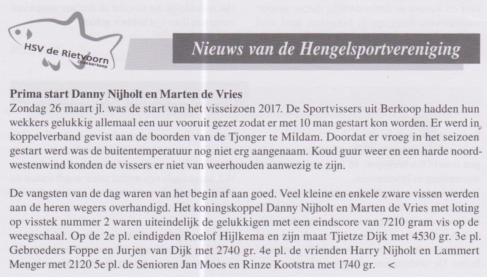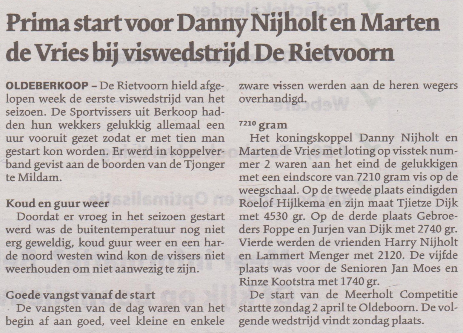Het koningskoppel Danny Nijholt en Marten de Vries met loting op visstek nummer 2 waren aan het eind de gelukkigen met een eindscore van 7210 gram vis op de weegschaal. Op de 2e pl. eindigden Roelof Hijlkema en zijn maat Tjietze Dijk met 4530 gr. 3e pl. Gebroeders Foppe en Jurjen van Dijk met 2740 gr. 4e pl. de vrienden Harry Nijholt en Lammert Menger met 2120 5e pl. de Senioren Jan Moes en Rinze Kootstra met 1740 gr.