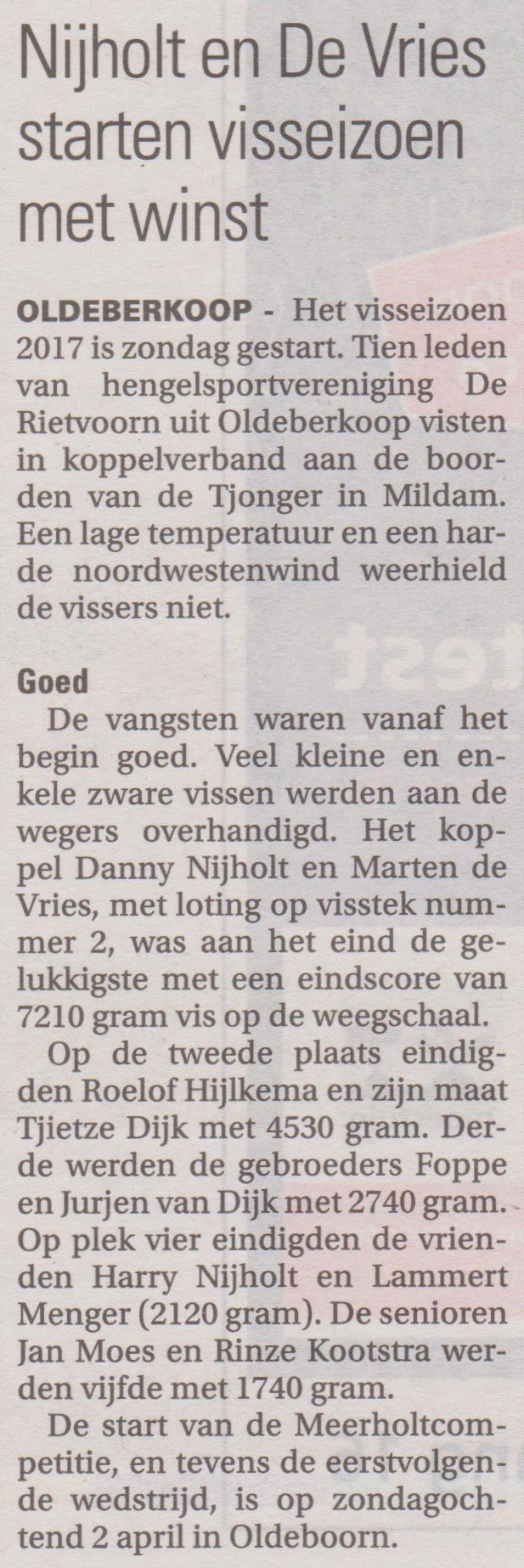 De start van de Meerholt Competitie en tevens de eerst volgende wedstrijd is zondag 2 april te Oldeboorn. Aanvang 7.00 uur vanaf de Carpoolplaats Oldeberkoop.