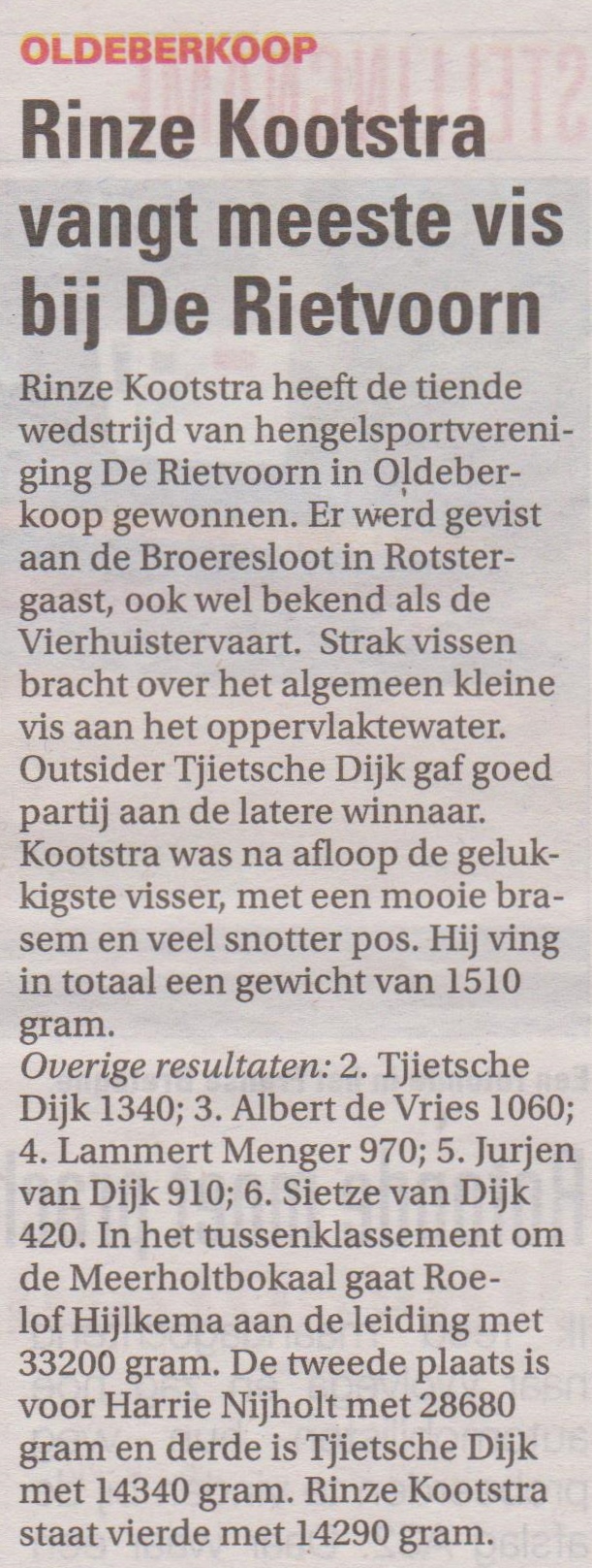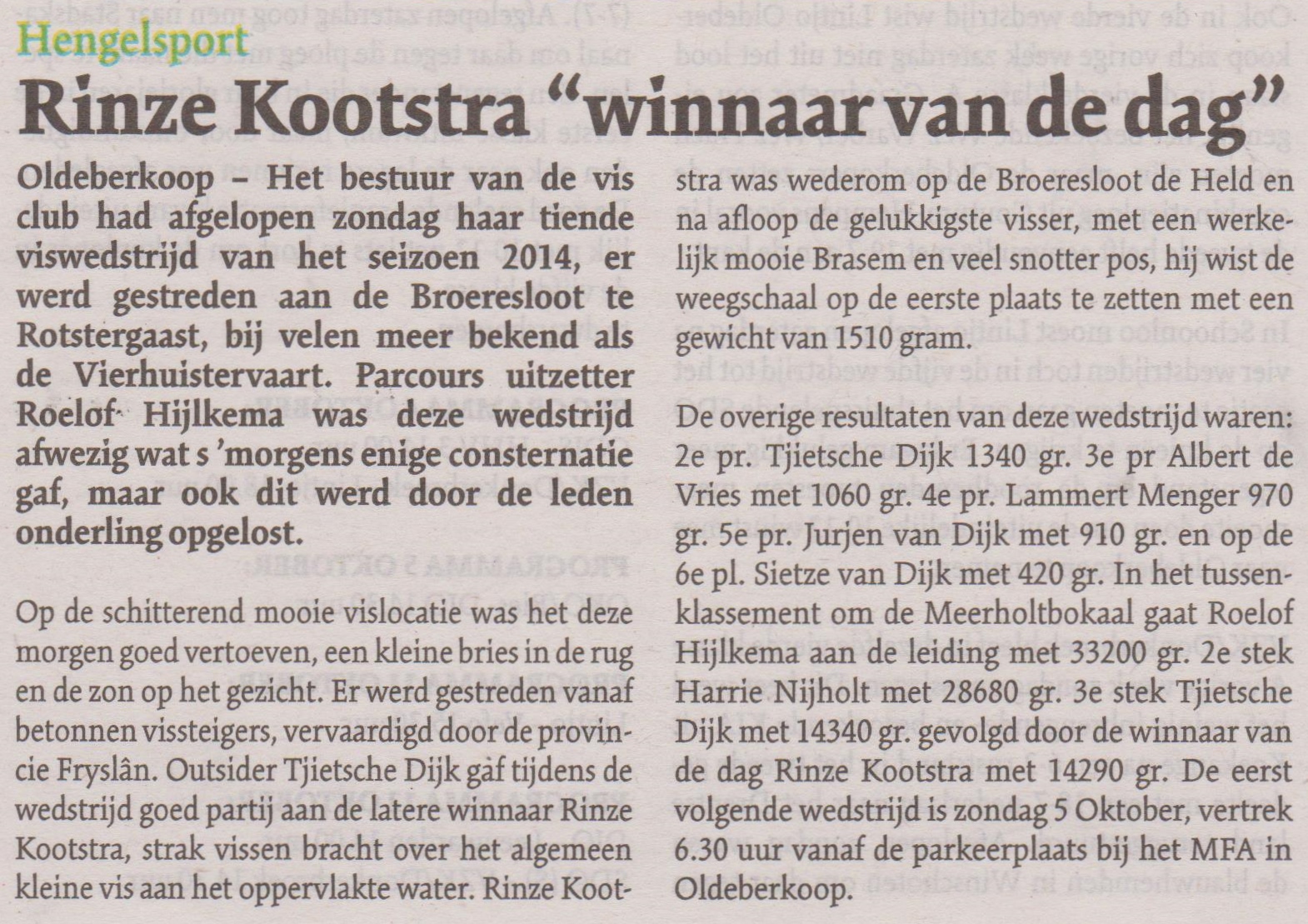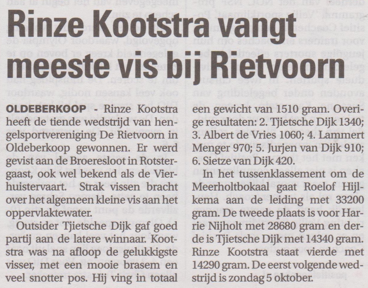 Parcours uitzetter Roelof Hijlkema was deze wedstrijd afwezig wat s ’morgens enige consternatie gaf, maar ook dit werd door de leden onderling opgelost. Op de schitterend mooie vislocatie was het deze morgen goed vertoeven, een kleine bries in de rug en de zon op het gezicht. Er werd gestreden vanaf betonnen vissteigers, vervaardigd door de provincie Fryslân. Outsider Tjietsche Dijk gaf tijdens de wedstrijd goed partij aan de latere winnaar Rinze Kootstra, strak vissen bracht over het algemeen kleine vis aan het oppervlakte water. Rinze Kootstra was wederom op de Broeresloot de Held en na afloop de gelukkigste visser, met een werkelijk mooie Brasem en veel snotter pos, hij wist de weegschaal op de eerste plaats te zetten met een gewicht van 1510 gram. De overige resultaten van deze wedstrijd waren: 2e pr. Tjietsche Dijk 1340 gr. 3e pr Albert de Vries met 1060 gr. 4e pr. Lammert Menger 970 gr. 5e pr. Jurjen van Dijk met 910 gr. en op de 6e pl. Sietze van Dijk met 420 gr. In het tussenklassement om de Meerholtbokaal gaat Roelof Hijlkema aan de leiding met 33200 gr. 2e stek Harrie Nijholt met 28680 gr. 3e stek Tjietsche Dijk met 14340 gr. gevolgd door de winnaar van de dag Rinze Kootstra met 14290 gr. De eerst volgende wedstrijd is zondag 5 Oktober, vertrek 6.30 uur vanaf de parkeerplaats bij het MFA in Oldeberkoop.