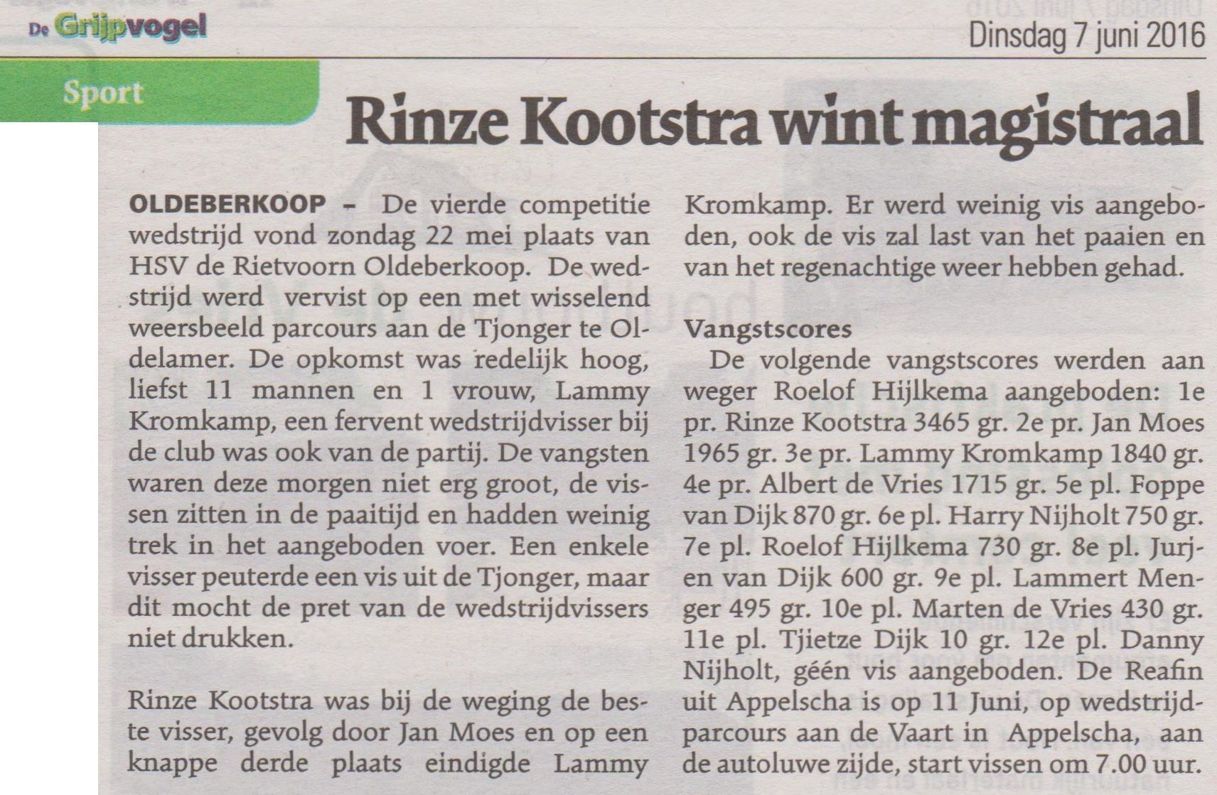 De volgende vangstscores werden aan weger Roelof Hijlkema aangeboden: 1e pr. Rinze Kootstra 3465 gr. 2e pr. Jan Moes 1965 gr. 3e pr. Lammy Kromkamp 1840 gr. 4e pr. Albert de Vries 1715 gr. 5e pl. Foppe van Dijk 870 gr. 6e pl. Harry Nijholt 750 gr. 7e pl. Roelof Hijlkema 730 gr. 8e pl. Jurjen van Dijk 600 gr. 9e pl. Lammert Menger 495 gr. 10e pl. Marten de Vries 430 gr. 11e pl. Tjietze Dijk 10 gr. 12e pl. Danny Nijholt, géén vis aangeboden. De eerst volgende wedstrijd is 5 Juni, Broeresloot. de Ooststellingwerf Cup 2016, organisatie de Reafin uit Appelscha is op 11 Juni, wedstrijdparcours Vaart Appelscha, autoluwe zijde, start vissen om 7.00 uur.