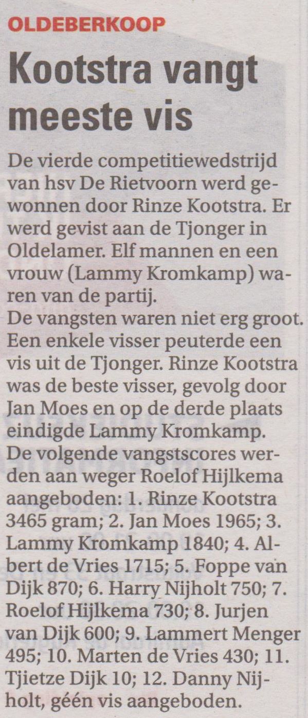 De vangsten waren deze morgen niet erg groot, de vissen zitten in de paaitijd en hadden weinig trek in het aangeboden voer. Een enkele visser peuterde een vis uit de Tjonger, maar dit mocht de pret van de wedstrijdvissers niet drukken. Rinze Kootstra was bij de weging de beste visser, gevolg door Jan Moes en op een knappe derde plaats eindigde Lammy Kromkamp. Er werd weinig vis aangeboden, ook de vis zal last van het paaien en van het regenachtige weer hebben gehad.
