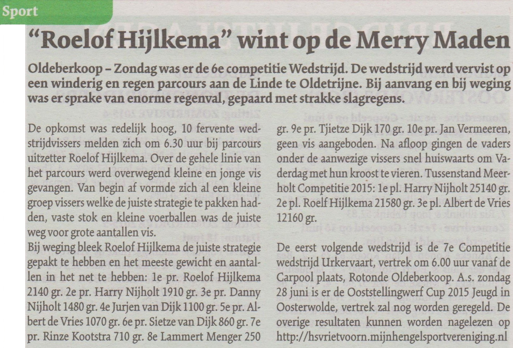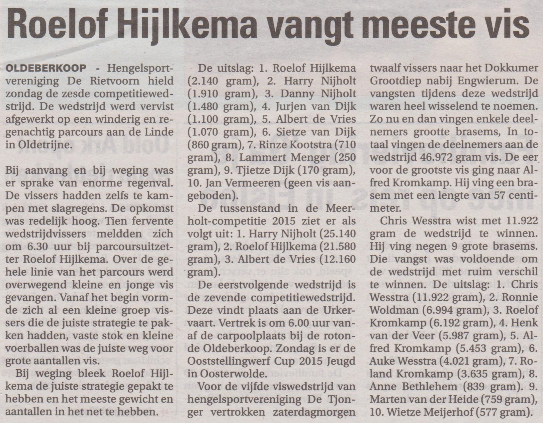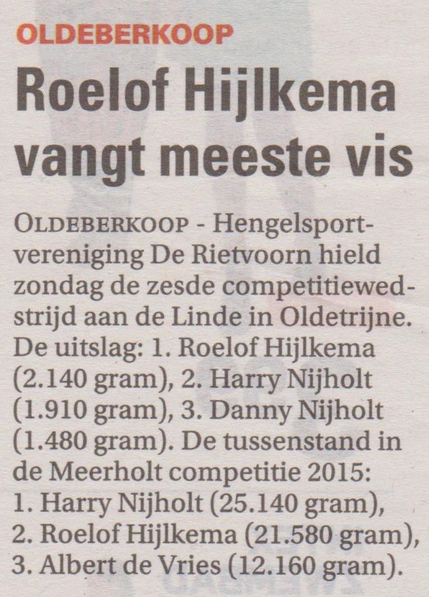 De opkomst was redelijk hoog, 10 fervente wedstrijdvissers melden zich om 6.30 uur bij parcours uitzetter Roelof Hijlkema. Over de gehele linie van het parcours werd overwegend kleine en jonge vis gevangen. Van begin af vormde zich al een kleine groep vissers welke de juiste strategie te pakken hadden, vaste stok en kleine voerballen was de juiste weg voor grote aantallen vis. Bij weging bleek Roelof Hijlkema de juiste strategie gepakt te hebben en het meeste gewicht en aantallen in het net te hebben: 1e pr. Roelof Hijlkema 2140 gr. 2e pr. Harry Nijholt 1910 gr. 3e pr. Danny Nijholt 1480 gr. 4e Jurjen van Dijk 1100 gr. 5e pr. Albert de Vries 1070 gr. 6e pr. Sietze van Dijk 860 gr. 7e pr. Rinze Kootstra 710 gr. 8e Lammert Menger 250 gr. 9e pr. Tjietze Dijk 170 gr. 10e pr. Jan Vermeeren, geen vis aangeboden. Na afloop gingen de vaders onder de aanwezige vissers snel huiswaarts om Vaderdag met hun kroost te vieren. Tussenstand Meerholt Competitie 2015: 1e pl. Harry Nijholt 25140 gr. 2e pl. Roelf Hijlkema 21580 gr. 3e pl. Albert de Vries 12160 gr. De eerst volgende wedstrijd is de 7e Competitie wedstrijd Urkervaart, vertrek om 6.00 uur vanaf de Carpool plaats, Rotonde Oldeberkoop. A.s. zondag 28 juni is er de Ooststellingwerf Cup 2015 Jeugd in Oosterwolde, vertrek zal nog worden geregeld. De overige resultaten kunnen worden nagelezen op http://hsvrietvoorn.mijnhengelsportvereniging.nl