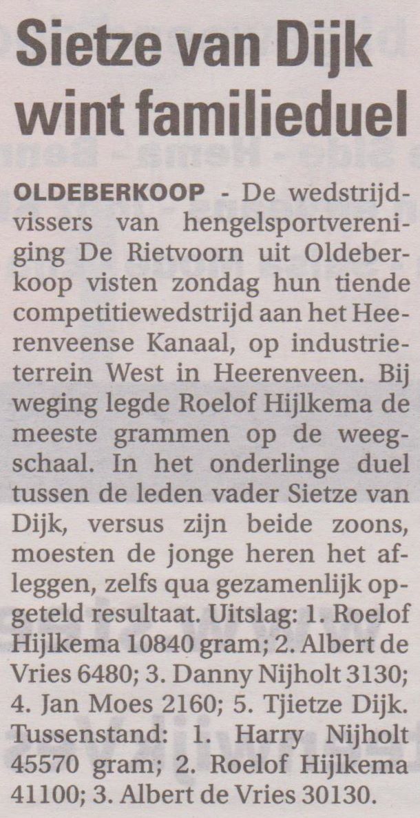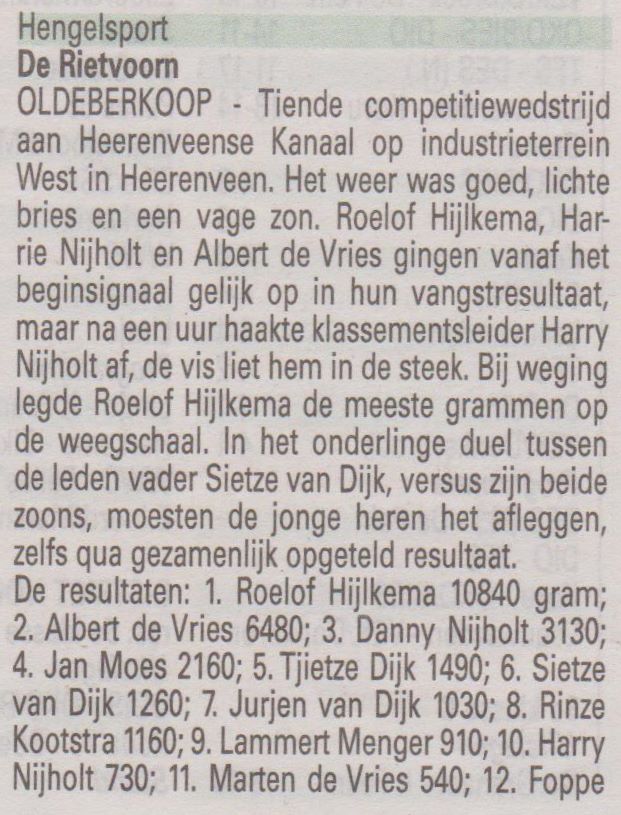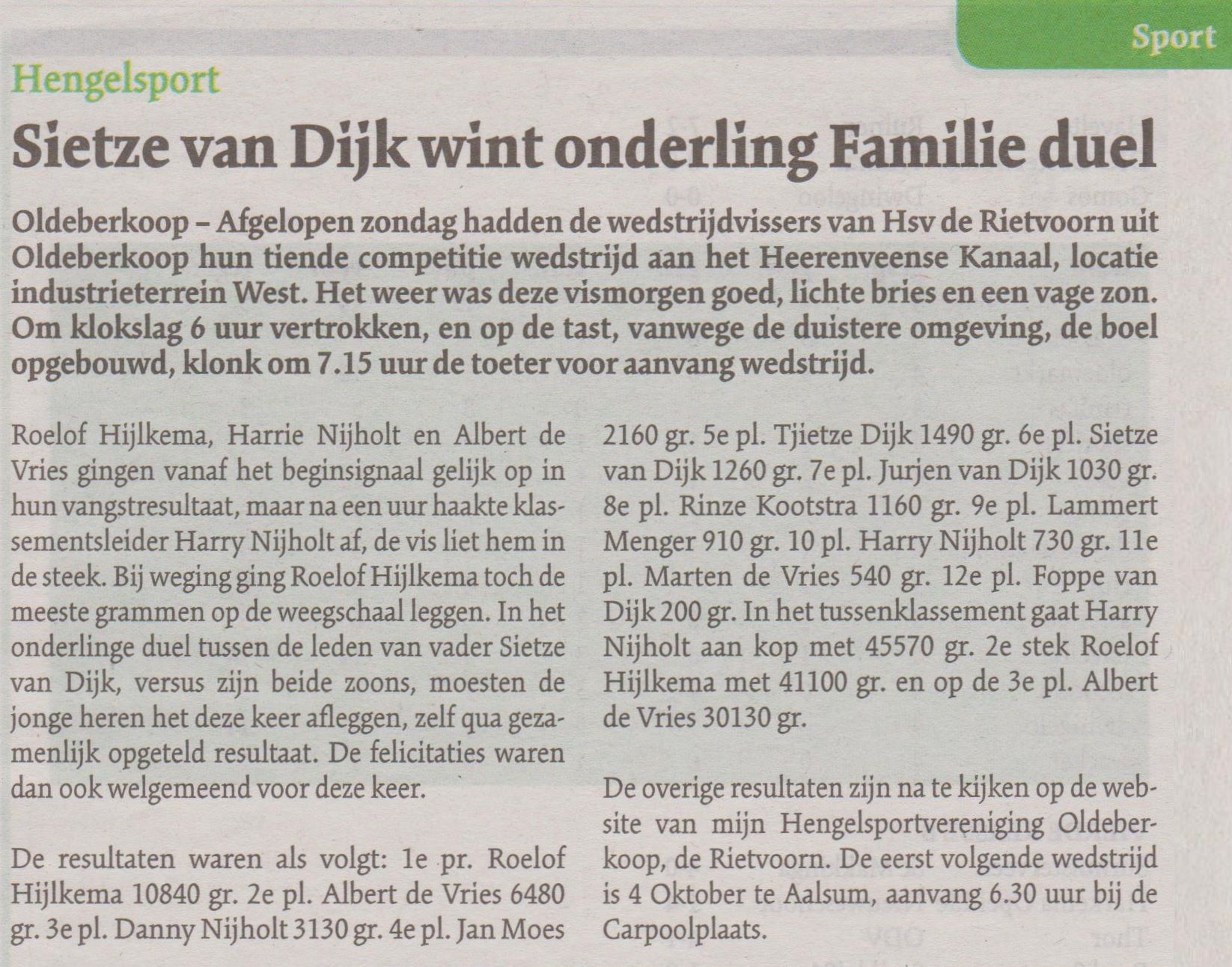De resultaten waren als volgt: 1e pr. Roelof Hijlkema 10840 gr. 2e pl. Albert de Vries 6480 gr. 3e pl. Danny Nijholt 3130 gr. 4e pl. Jan Moes 2160 gr. 5e pl. Tjietze Dijk 1490 gr. 6e pl. Sietze van Dijk 1260 gr. 7e pl. Jurjen van Dijk 1030 gr. 8e pl. Rinze Kootstra 1160 gr. 9e pl. Lammert Menger 910 gr. 10 pl. Harry Nijholt 730 gr. 11e pl. Marten de Vries 540 gr. 12e pl. Foppe van Dijk 200 gr. In het tussenklassement gaat Harry Nijholt aan kop met 45570 gr. 2e stek Roelof Hijlkema met 41100 gr. en op de 3e pl. Albert de Vries 30130 gr. De overige resultaten zijn na te kijken op de website van mijn Hengelsportvereniging Oldeberkoop, de Rietvoorn. De eerst volgende wedstrijd is 4 Oktober te Aalsum, aanvang 6.30 uur bij de Carpoolplaats.