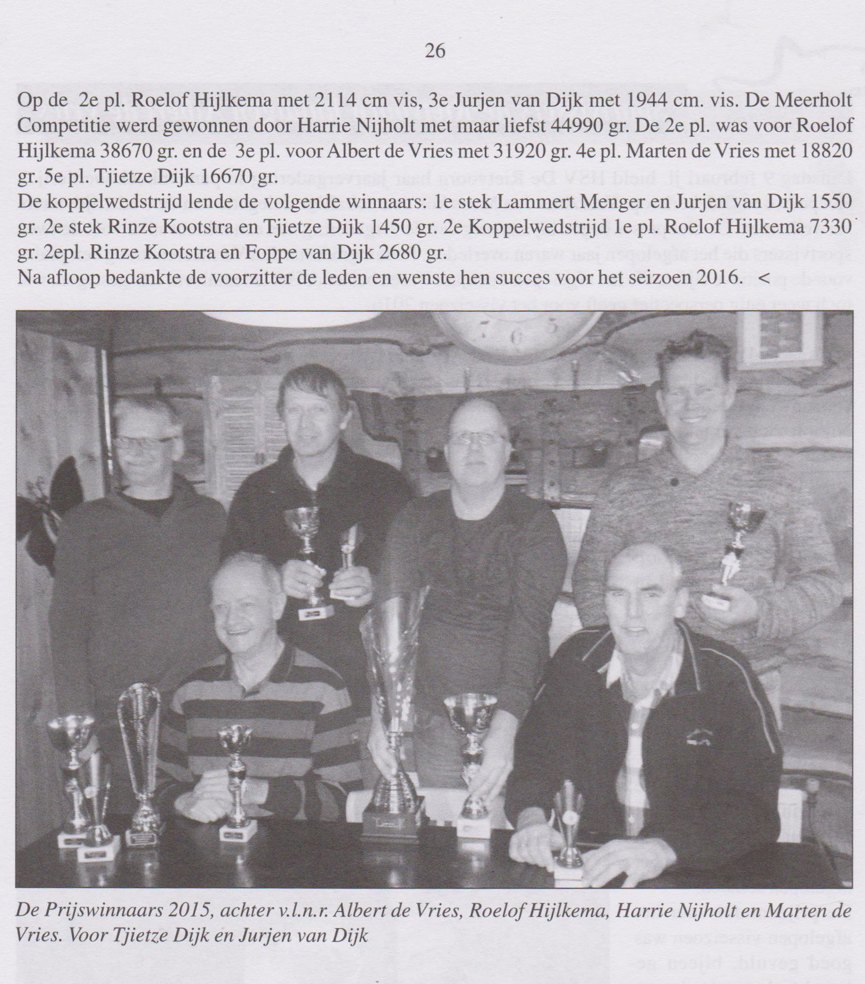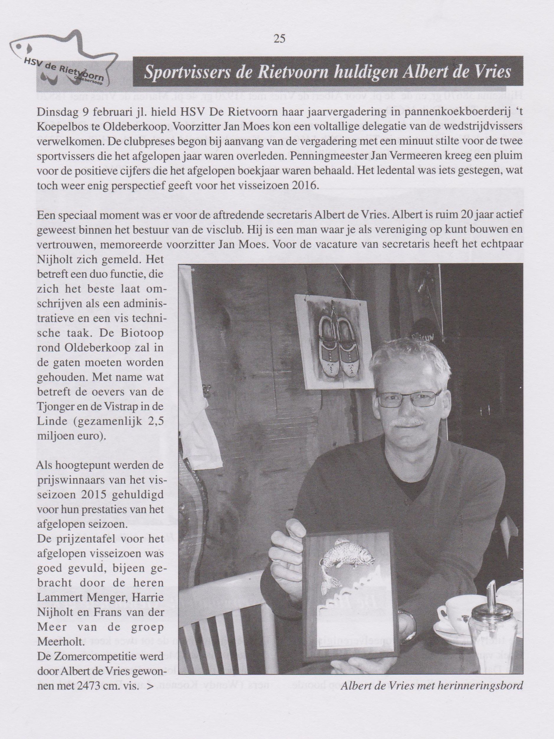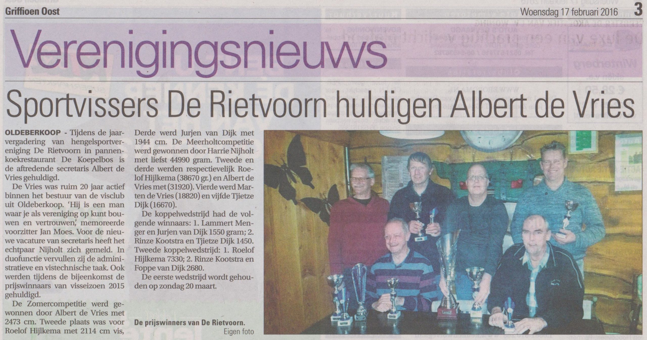 Voor de nieuwe vacature van secretaris heeft het echtpaar Nijholt zich gemeld, het betreft een duo functie welke zich het beste laat omschrijven met een administratieve en een vistechnische taak. De Biotoop rond Oldeberkoop zal in de gaten worden gehouden, met name voor de oevers van de Tjonger en de Vis trap van gezamenlijk 2,5 miljoen euro in de Linde. Als hoogtepunt werden de prijswinnaars van het afgelopen visseizoen 2015 gehuldigd voor hun prestaties van het afgelopen seizoen. De wedstrijdvissers uit Oldeberkoop hielden hun jaarvergadering in het pannenkoeken Restaurant de Koepelbos te Oldeberkoop. Voorzitter Jan Moes kon een voltallige delegatie van de wedstrijdvissers verwelkomen. De clubpreses begon bij aanvang van de vergadering met een minuut stilte voor de 2 vissers welke het afgelopen jaar waren overleden. De penningmeester Jan Vermeeren kreeg een pluim voor de positieve cijfers welke het afgelopen boekjaar werden gedraaid, debet. Het ledental was weer iets gestegen, wat toch weer enig perspectief geeft om het visseizoen 2016 weer sterk in te gaan. De prijzentafel voor het afgelopen visseizoen was goed gevuld, bijeen gebracht door de heren Lammert Menger, Harrie Nijholt en Frans van der Meer van de groep Meerholt. De Zomercompetitie werd door Albert de Vries met 2473 cm. 2e pl. Roelof Hijlkema met 2114 cm vis, 3e Jurjen van Dijk met 1944 cm. De Meerholt Competitie werd gewonnen door Harrie Nijholt met maar liefst 44990 gr. 2e pl. Roelof Hijlkema 38670 gr. 3e pl. Albert de Vries met 31920 gr. 4e pl. Marten de Vries met 18820 gr. 5e pl. Tjietze Dijk 16670 gr. De koppelwedstrijd had de volgende winnaars: 1e stek Lammert Menger en Jurjen van Dijk 1550 gr. 2e stek Rinze Kootstra en Tjietze Dijk 1450 gr. 2e Koppelwedstrijd 1e pl. Roelof Hijlkema 7330 gr. 2epl. Rinze Kootstra en Foppe van Dijk 2680 gr. Na afloop bedankte de voorzitter de leden en wenste hun succes voor het seizoen 2016. De eerste wedstrijd zal gehouden worden op zondag 20 maart, vertrek 7.00 uur. Vanaf de Carpoolplaats, Rotonde te Oldeberkoop.