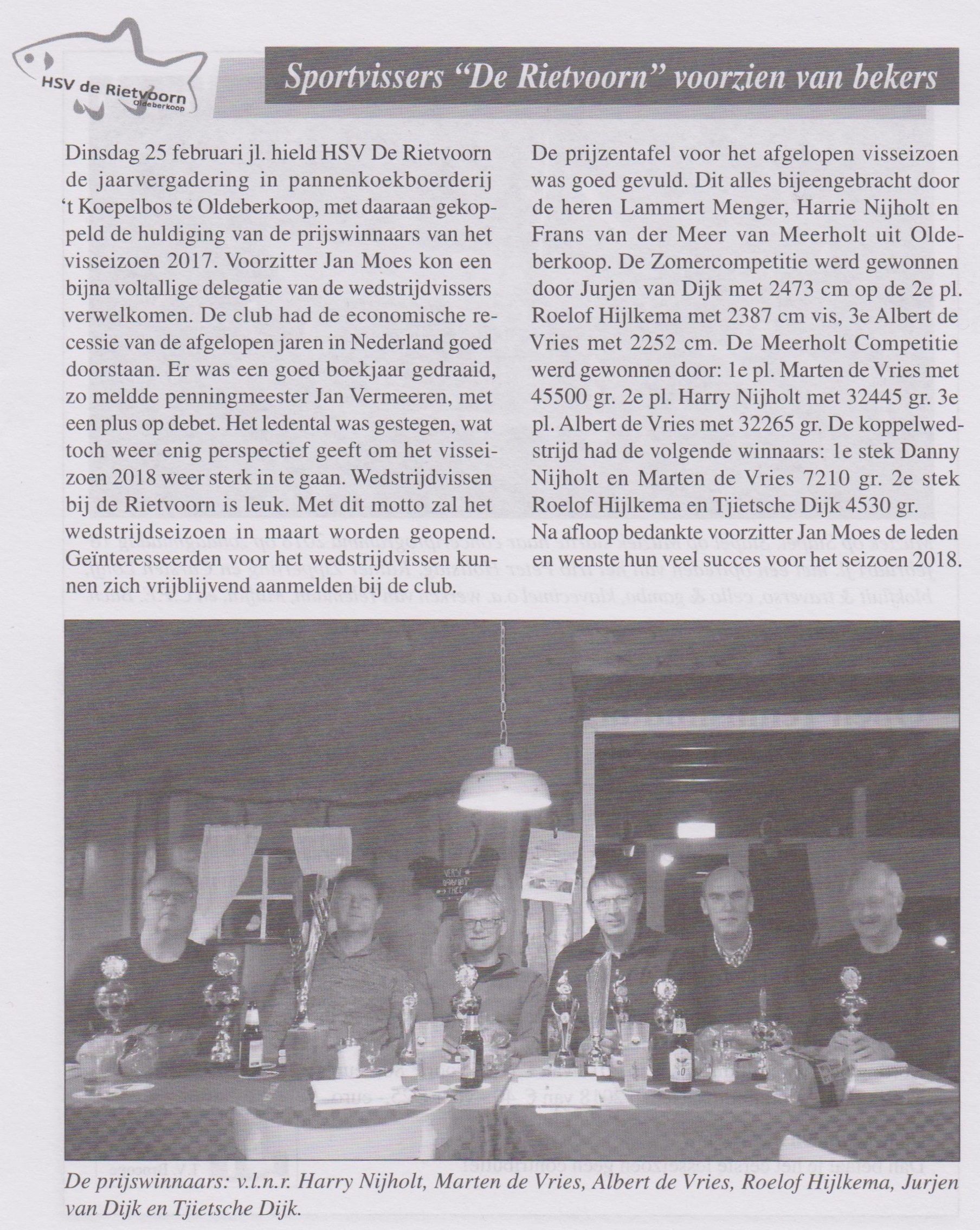 Voorzitter Jan Moes kon een bijna voltallige delegatie van de wedstrijdvissers verwelkomen. De club had de economische recessie van de afgelopen jaren in Nederland goed doorstaan, er was een batig goed boekjaar gedraaid melde de penningmeester, Dhr. Jan Vermeeren, met een plus op Debet. Het ledental was gestegen, wat toch weer enig perspectief geeft om het visseizoen 2018 weer sterk in te gaan. Wedstrijd vissen bij de Rietvoorn is leuk, met dit motto zal het wedstrijdseizoen worden geopend in maart. Mocht je zin hebben aan wedstrijdvissen meld je vrijblijvend aan bij de club. De prijzentafel voor het afgelopen visseizoen was goed gevuld, bijeen gebracht door de heren Lammert Menger, Harrie Nijholt en Frans van der Meer van Meerholt uit Oldeberkoop.