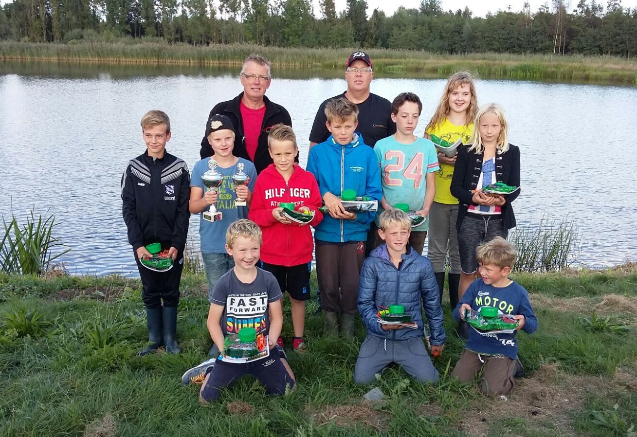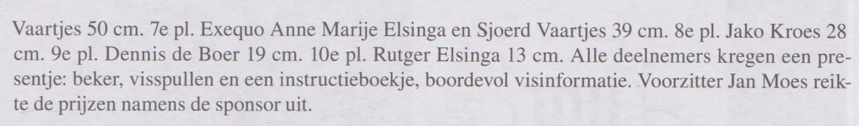 De einduitslag was als volgt: 1e pr. Tygo Moes 319 cm. 2e pl. Seles de Jong 238 cm. 3e pl. Jelte Sijens 146 cm. 4e pl. Anouk Kroezen 82 cm. 5e pl. Jorn Elsinga 64 cm. 6e pl. Klaas Vaartjes 50 cm. 7e pl. Exequo Anne Marije Elsinga en Sjoerd Vaartjes 39 cm. 8e pl. Jako Kroes 28 cm. 9e pl. Dennis de Boer 19 cm. 10e pl. Rutger Elsinga 13 cm. Alle deelnemers kregen als cadeaus, bekers, visspullen en een instructieboekje boordevol visinformatie. De Voorzitter Jan Moes reikte de prijzen namens de sponsor uit.