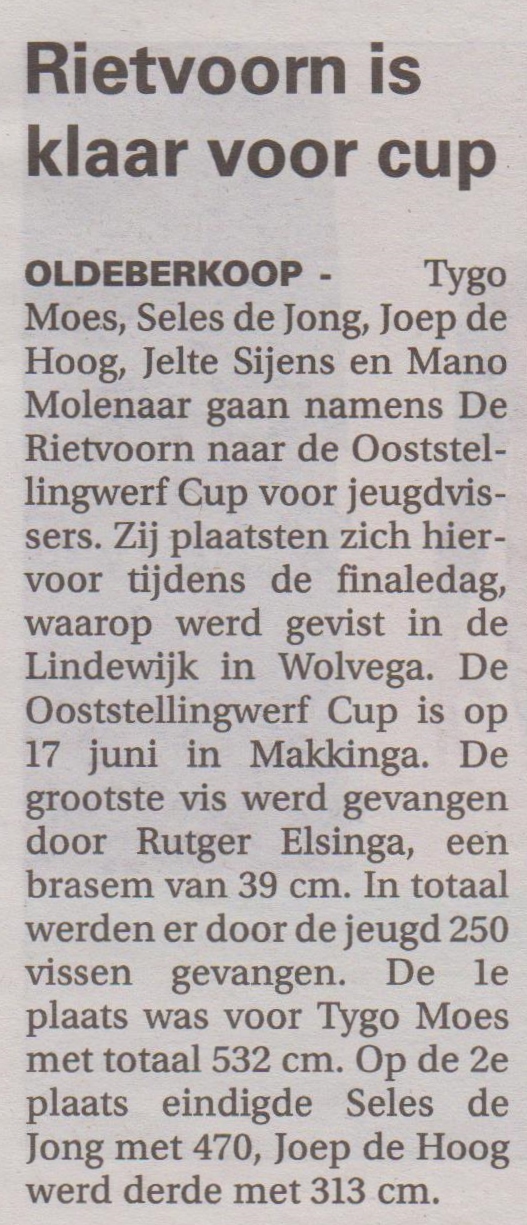 De overige resultaten zijn na te lezen op de website van HSV de Rietvoorn. De Jeugdwedstrijd Ooststellingwerf Cup 2018 is op 17 Juni in Makkinga, organisatie visclub de Tjonger. Naafloop werden de prijzen uitgereikt door de voorzitter Jan Moes.