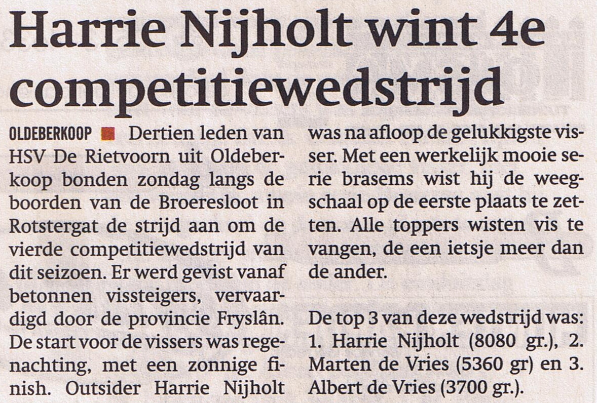 Parcours uitzetter Roelof Hijlkema mocht 13 wedstrijdvissers verwelkomen op een schitterend mooie vislocatie. Er werd gestreden vanaf betonnen vissteigers, vervaardigd door de provincie Fryslân. De start voor de vissers was regenachting, met een zonnige finish. Outsider Harrie Nijholt was na afloop de gelukkigste visser, met een werkelijk mooie serie Brasems wist hij de weegschaal op de eerste plaats te zetten. Alle toppers wisten vis te vangen, de een ietsje meer dan de ander. De einduitslag van deze wedstrijd was: 1e pr. Harrie Nijholt 8080 gr. 2e pr Marten de Vries 5360 gr, 3e pr. Albert de Vries 3700 gr. 4e pr. Jurjen van Dijk 3400 gr. 5e pr. Rinze Kootstra 2860 gr, 6e pr. Tjietsche Dijk 2700 gr. 7e pr. Lammert Menger 2180 gr. 8e pr. Danny Nijholt 1340 gr. 9e pr. Roelof Hijlkema 1360 gr. 10e pr. Jan Vermeeren 500 gr. 11e pr. Foppe van Dijk 200 gr. 12e pr. Jan Moes 100 gr. De eerst volgende wedstrijd is Zondag 5 Juni, Merry Maden, vertrek 6.00 uur vanaf de parkeerplaats bij bank Berkoop. Aanstaande Zaterdag 28 mei is er de Nationale Hengeldag in Oldeberkoop, aanvang 14.00 uur bij de Brug over de Tjonger.